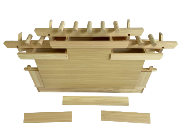 扉には見た目も美しい格子扉を仕様し金具は、一切あえて使用せず桧の飾りも見事な一品です。