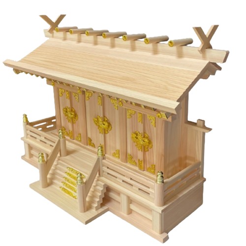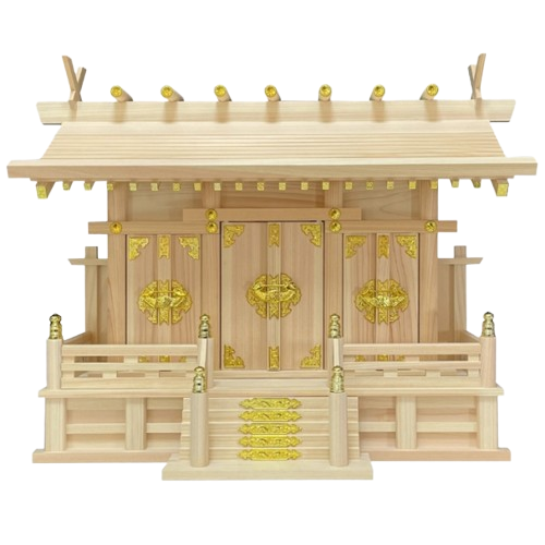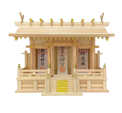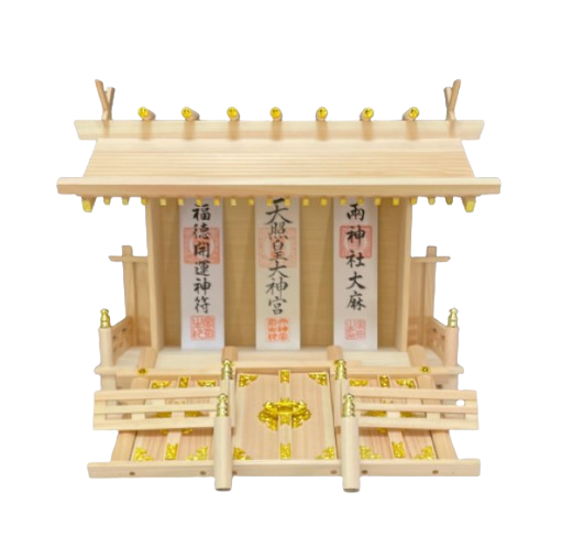 頂いたお札を重ねることなく丁寧にお祀りできるようになっている三社のデザインで、仕事場から一般のご家庭まで場所を選ばず設置でき、通し屋根のシンプルですっきりした上品な雰囲気となってます。