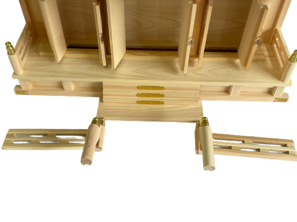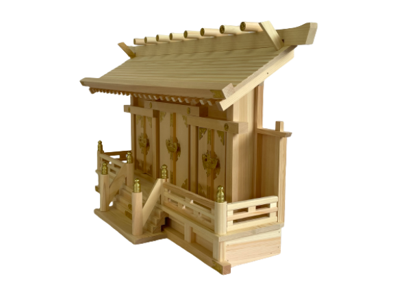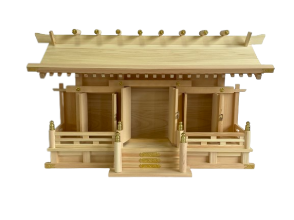 通し屋根の御宮です。 最高級の木曽桧を使い御札を入れやすい構造で欄干を取外し可能。 通しなので左右でも中央と同じサイズの御札が入ります。