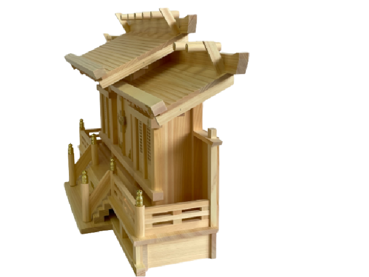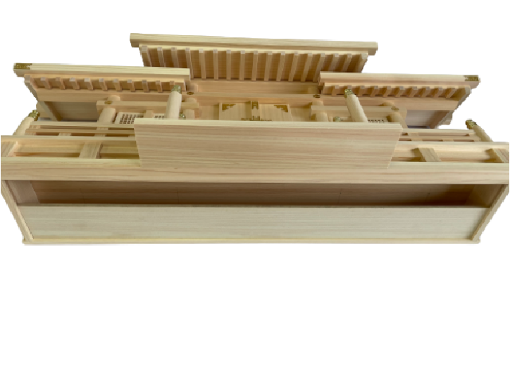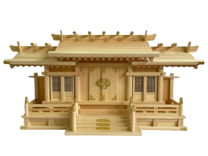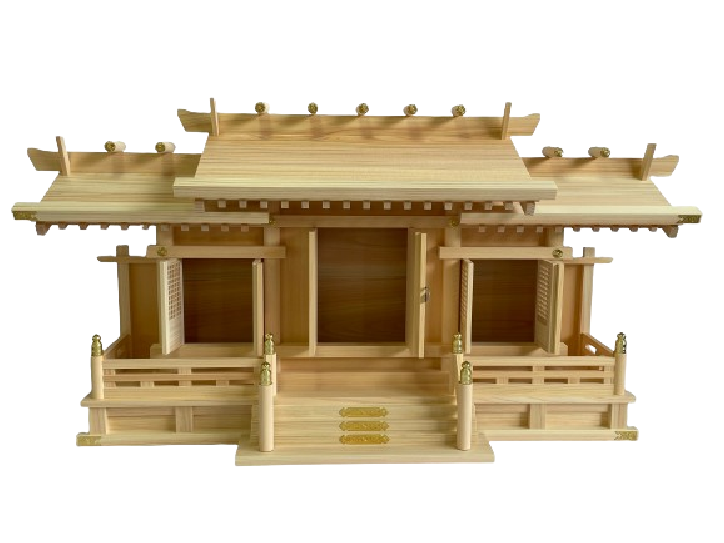 木曽桧にて製作した大型の格子三社神棚。左右は格子扉、大型ですが奥行は薄型になっております。装飾金具は真鍮製を使用して自然な輝きを放ちます。※中央扉と神棚下より神棚の中に御神札を入れます。※木の御神札は中央扉から27cm以下まで入ります。